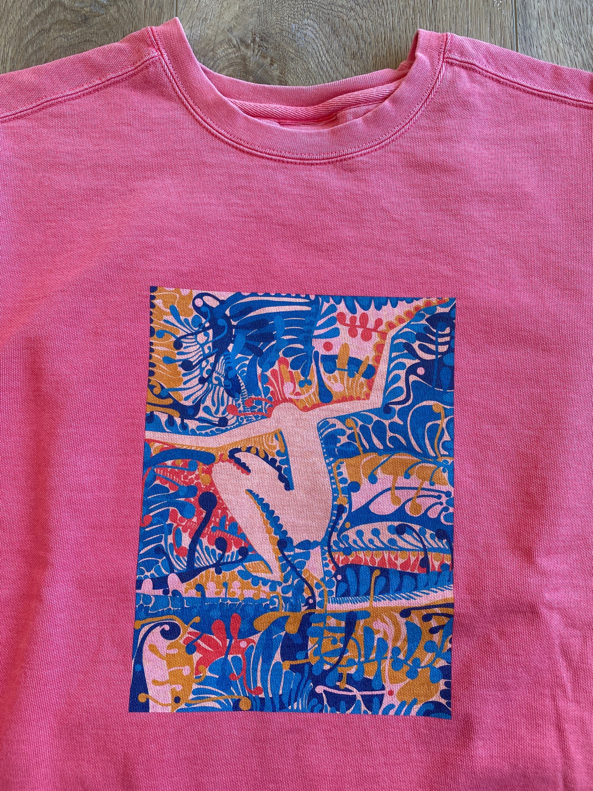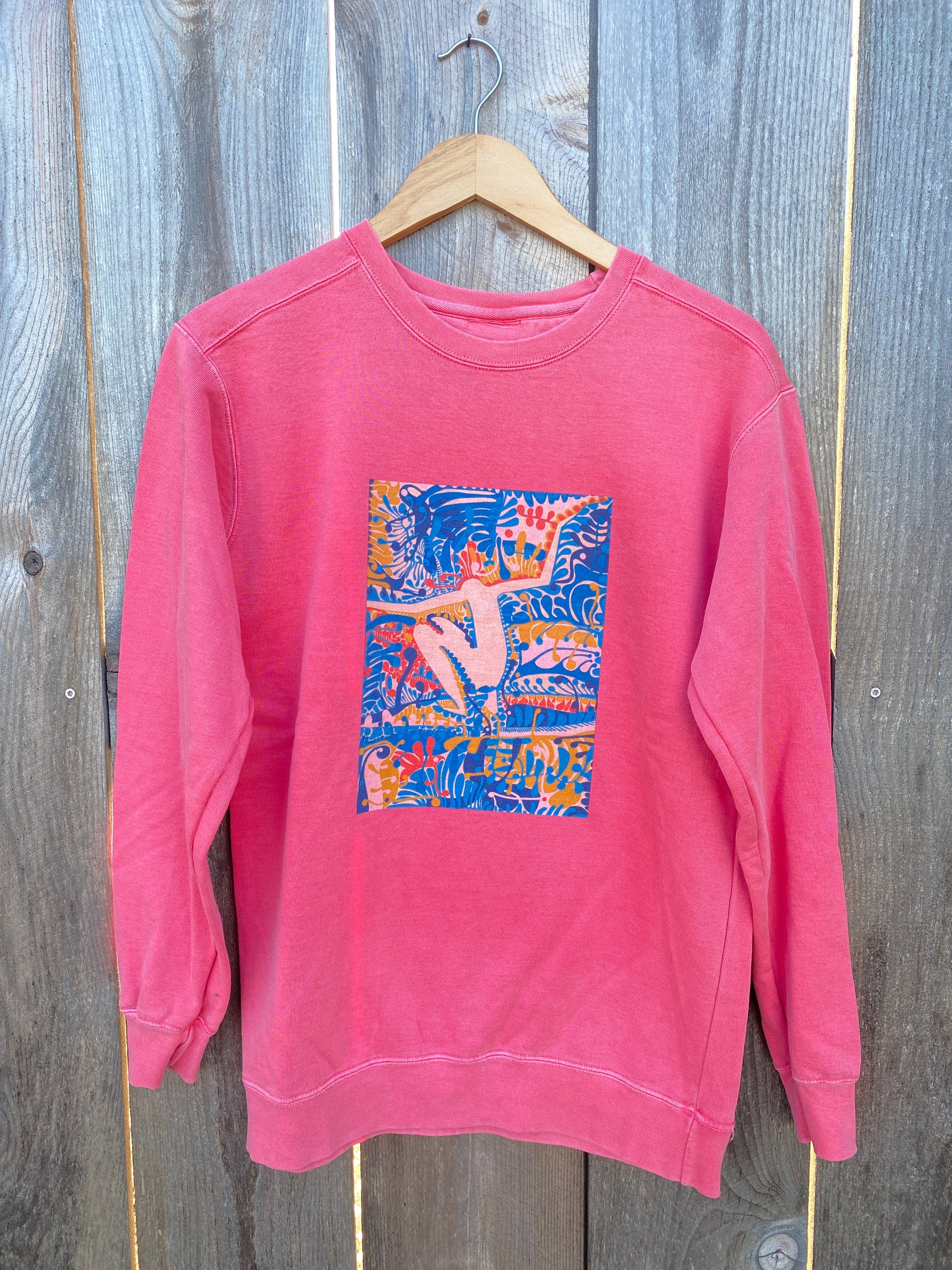 Andy's Magic Island print featured on classic crew fleece - Coral